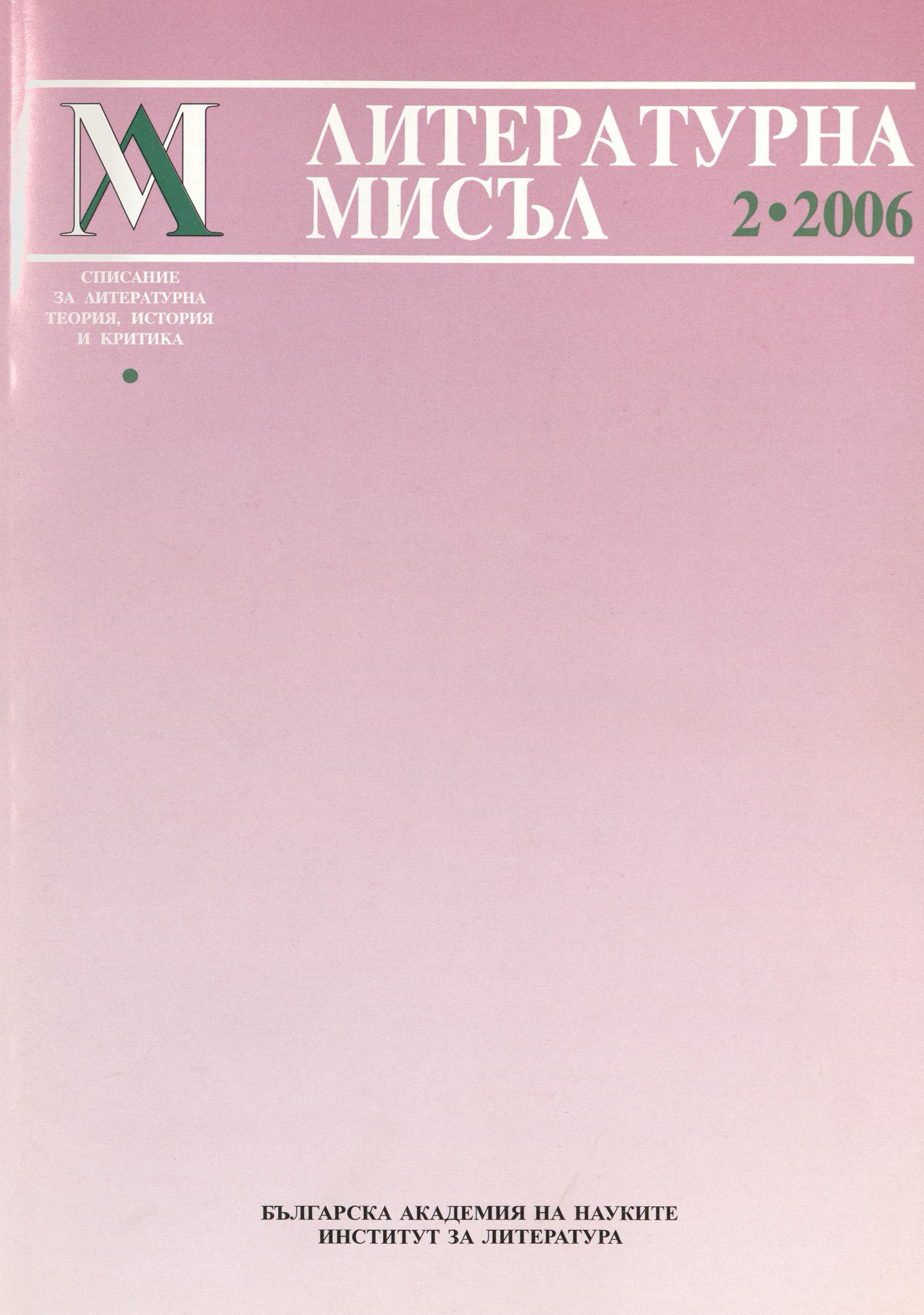 Ключови думиРезюмеThe text is focused on some characteristics of Nikolay Liliev's critical-essayistic prose - its dialogue with the author's fiction and the projection of the self in it, as well as its dialogue with the French stylistic tradition. Emphasized is Liliev's role as an enlightener and spiritual mediator, as a successor and proficient interpretator of West-European Modernism. Despite their receptive-interpretative character and the collage citation of foreign authors, a number of early articles, portraits, and essays of Liliev on modern West-European writers function as manifestoes of Bulgarian Modernism. The paper also examines the critical-essayistic texts of Liliev on Bulgarian writers and underlines the author's heuristic spirit and his portraitist skills. Taken into consideration are Liliev's late academical studies on Russian and West-European classics in regard to the literary and theatrical reception of those authors in Bulgaria.